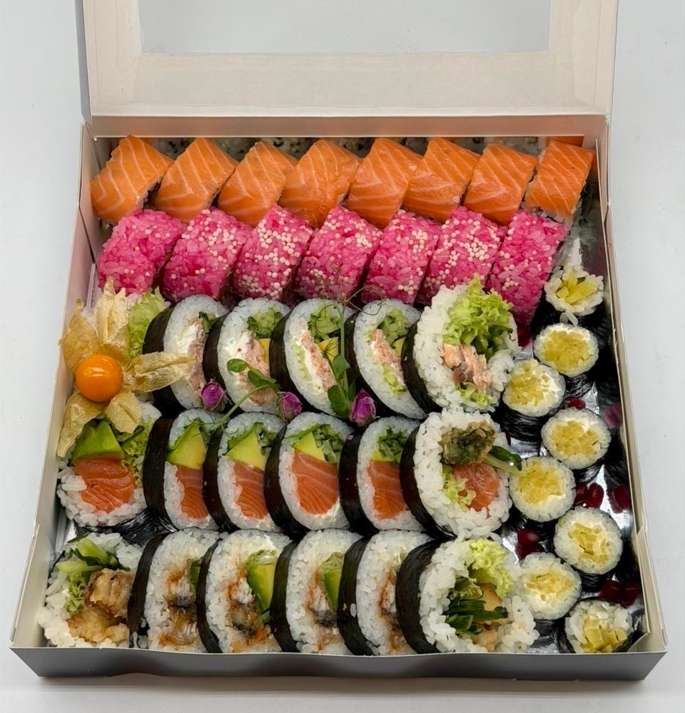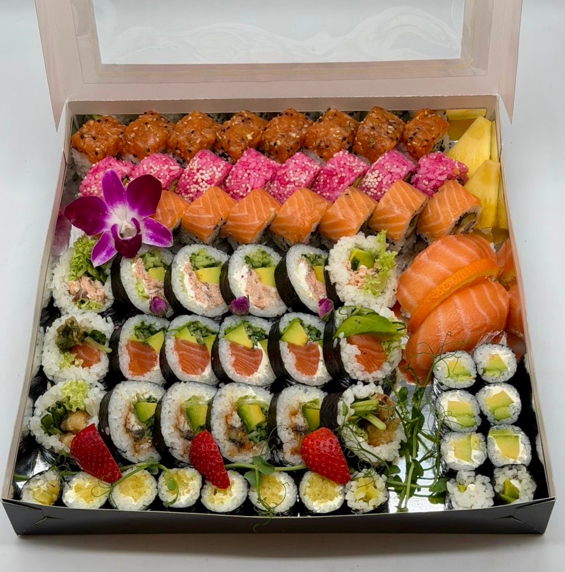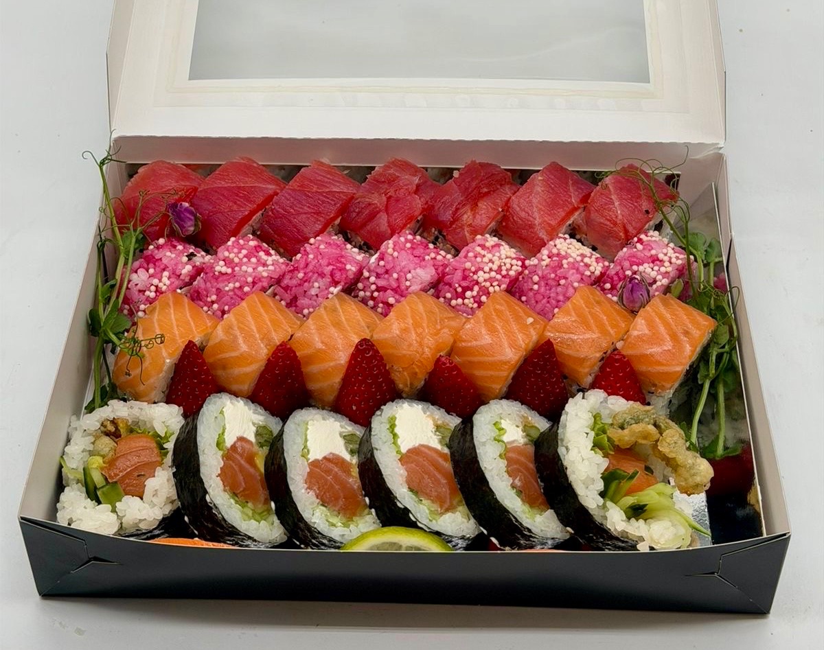Każdy zestaw będzie pięknie ozdobiony, polany dedykowanymi sosami oraz posypany sezamem.