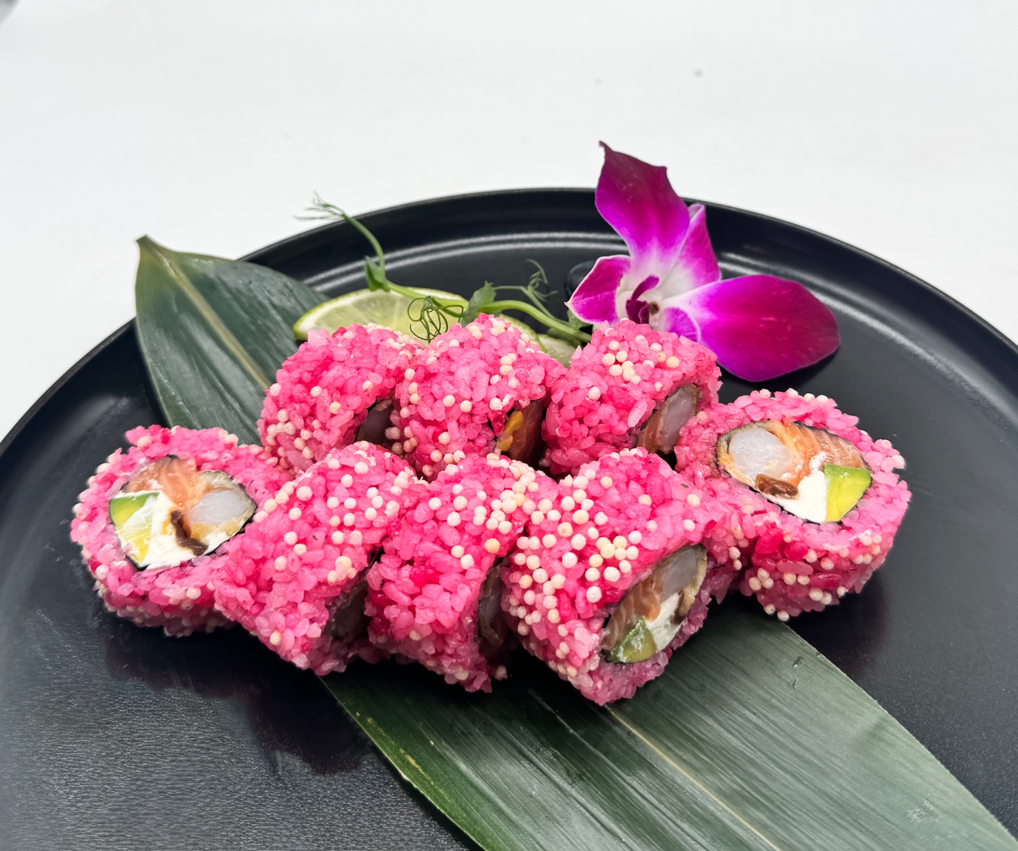 Uramaki krewetka w tempurze obłożone łososiem 8 szt.