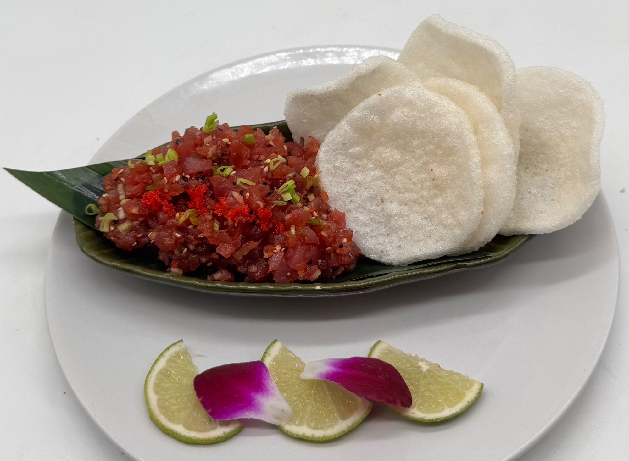warzywa w tempurze, serek, sezam, tatar z łososia